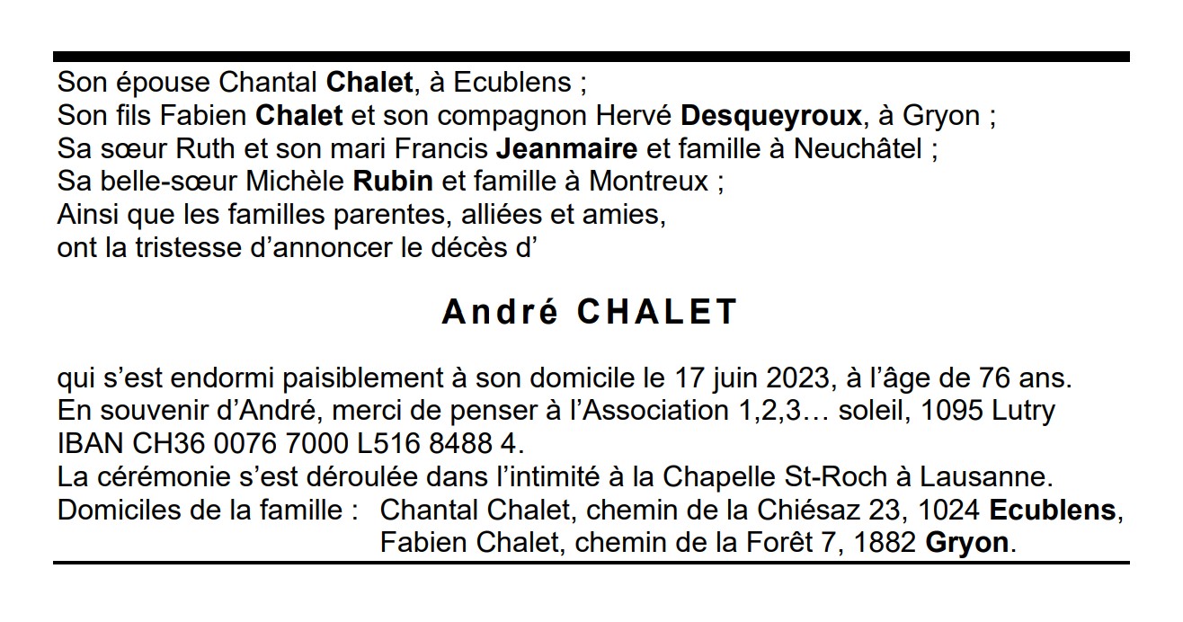 André CHALET 24 oct. 1947 - 17 juin. 2023 Avis mortuaire PFG Télecharger PDF Partager sur: Galerie PreviousNext PreviousNext