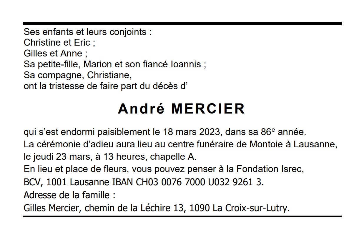 André MERCIER 06 jan. 1938 - 18 mar. 2023 Avis mortuaire PFG Télecharger PDF Partager sur: Galerie PreviousNext PreviousNext