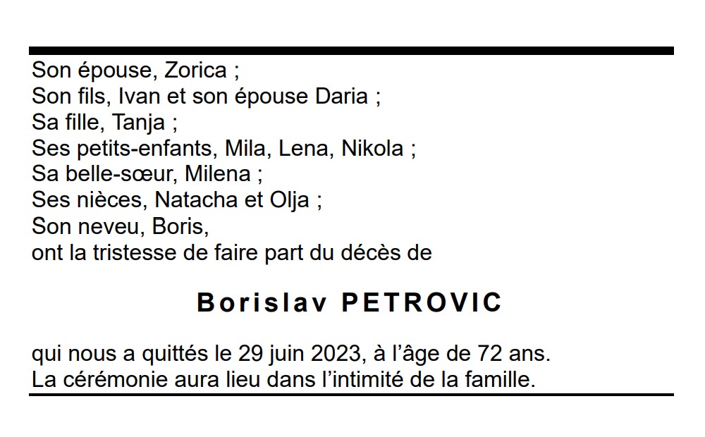 Borislav PETROVIC 06 nov. 1950 - 29 juin. 2023 Avis mortuaire PFG Télecharger PDF Partager sur: Galerie PreviousNext PreviousNext
