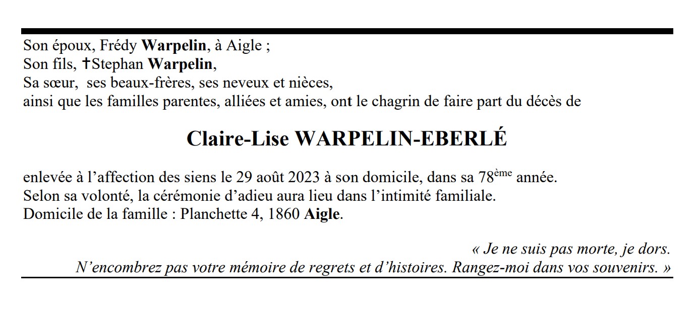 Claire-Lise WARPELIN-EBERLÉ 03 mai. 1946 - 29 aoû. 2023 Avis mortuaire PFG Télecharger PDF Partager sur: Galerie PreviousNext PreviousNext