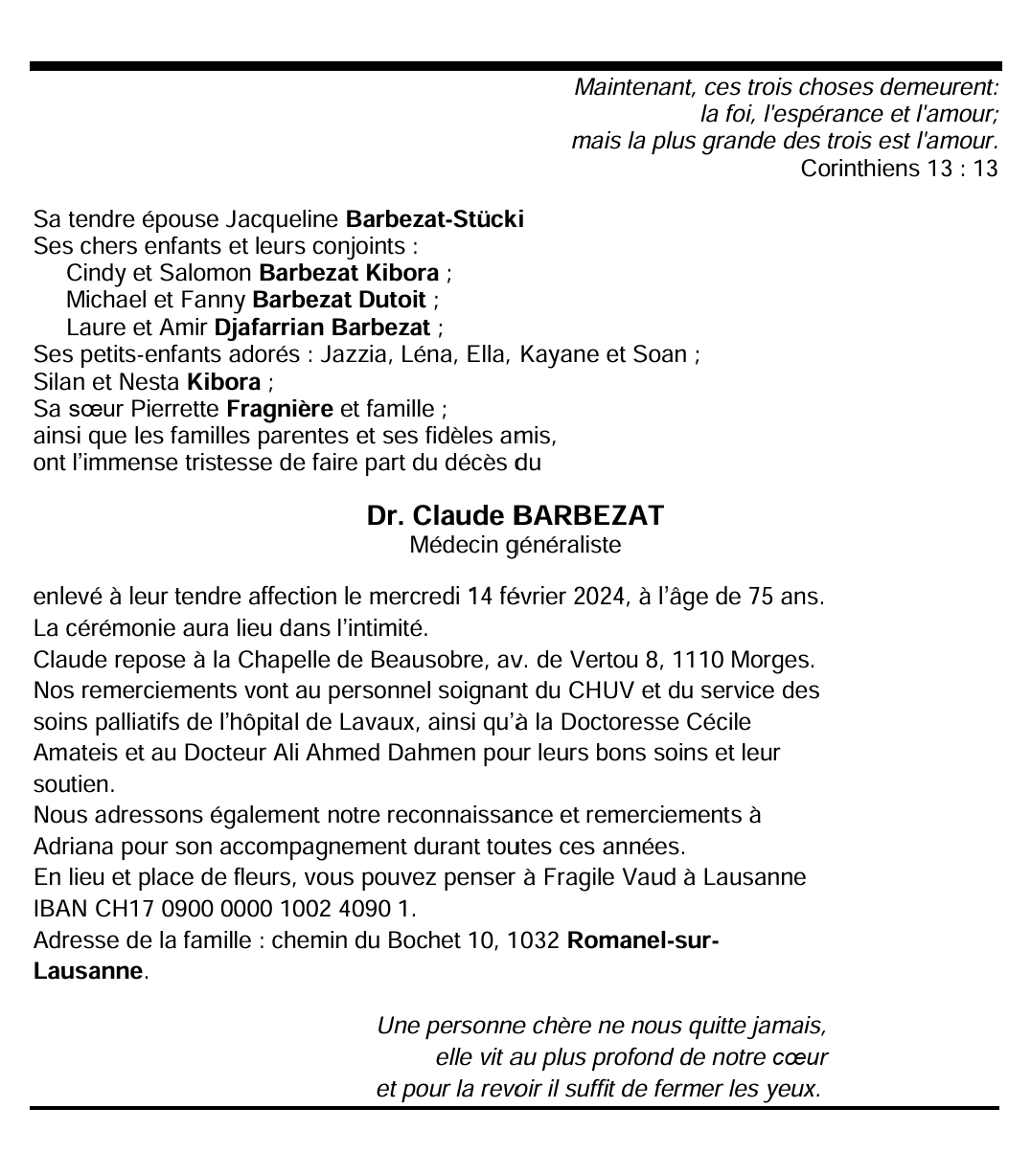 Dr. Claude BARBEZAT Médecin généraliste 23 sep. 1948 - 14 fév. 2024 Avis mortuaire PFG Télecharger PDF Partager sur: Galerie PreviousNext PreviousNext