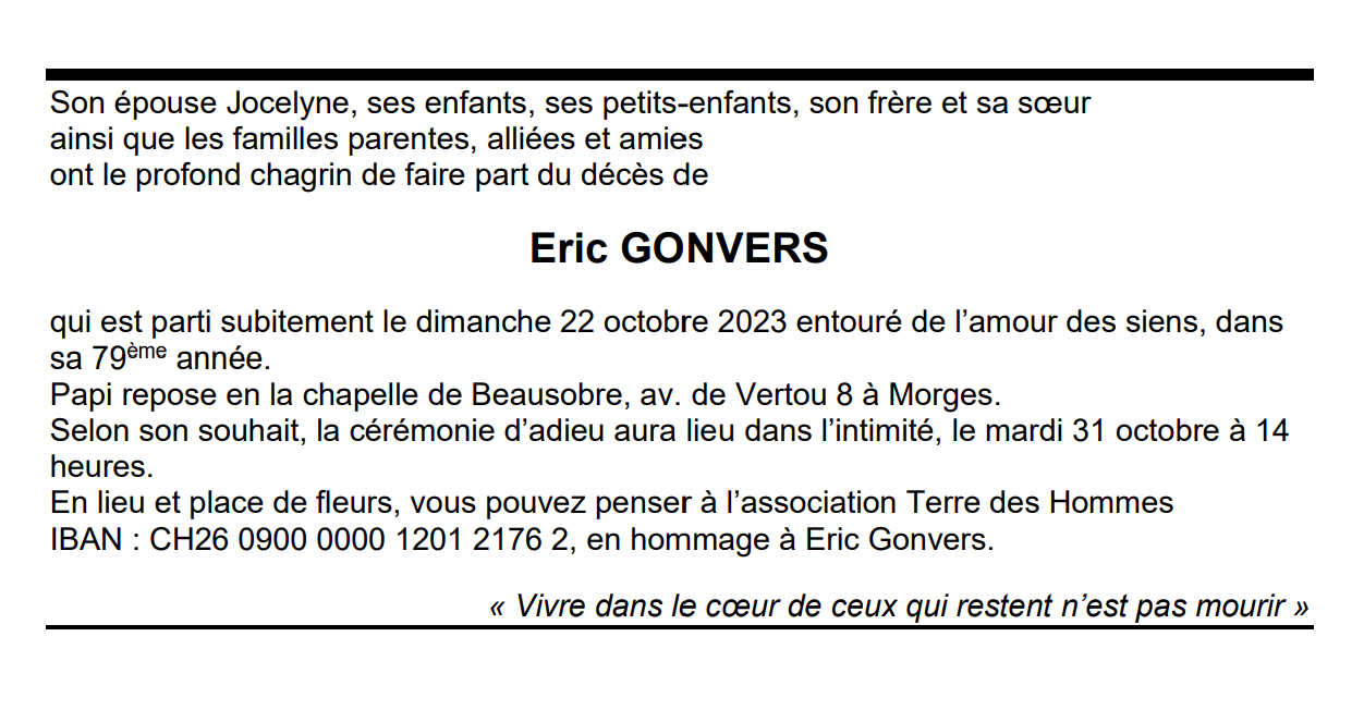 Eric GONVERS 19 déc. 1944 - 22 oct. 2023 Avis mortuaire PFG Télecharger PDF Partager sur: Galerie PreviousNext PreviousNext