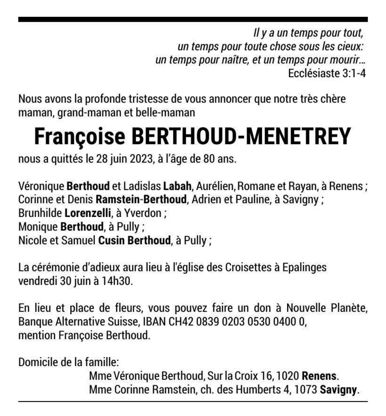 Françoise BERTHOUD-MENETREY 05 mar. 1943 - 28 juin. 2023 Avis mortuaire PFG Télecharger PDF Partager sur: Galerie PreviousNext PreviousNext
