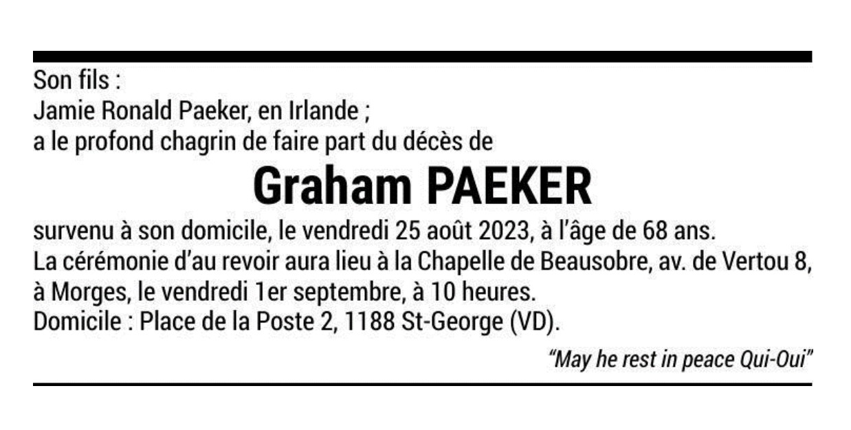 Graham PAEKER 29 juil. 1955 - 25 aoû. 2023 Avis mortuaire PFG Télecharger PDF Partager sur: Galerie PreviousNext PreviousNext
