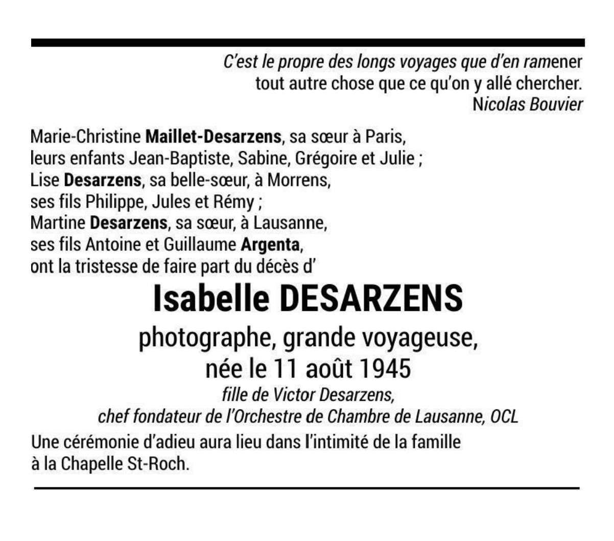 Isabelle DESARZENS photographe, grande voyageuse, fille de Victor Desarzens 11 aoû. 1945 - 19 aoû. 2023 Avis mortuaire PFG Télecharger PDF Partager sur: Galerie PreviousNext PreviousNext