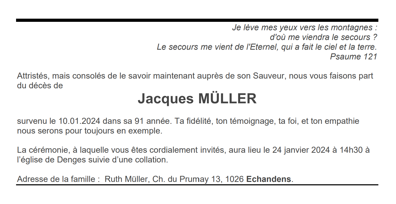 Jacques MÜLLER 09 jan. 1934 - 10 jan. 2024 Avis mortuaire PFG Télecharger PDF Partager sur: Galerie PreviousNext PreviousNext