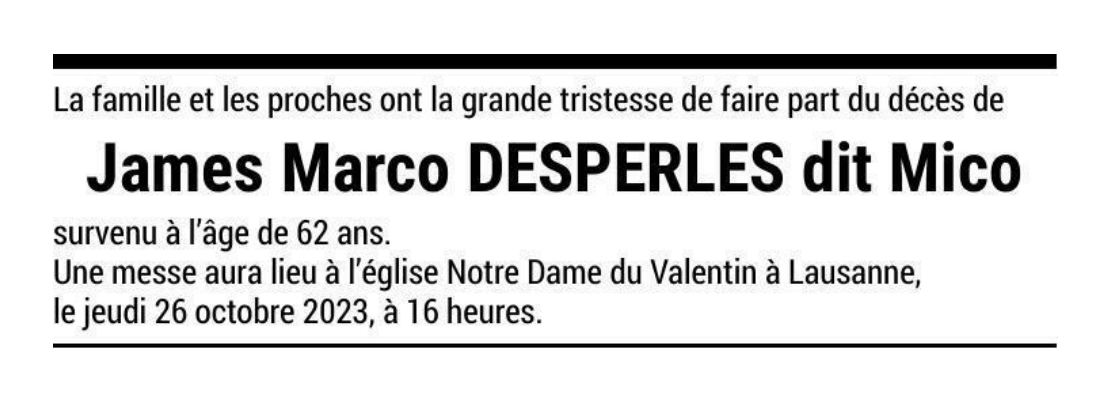 James Marco DESPERLES dit Mico 25 avr. 1961 Avis mortuaire PFG Télecharger PDF Partager sur: Galerie PreviousNext PreviousNext