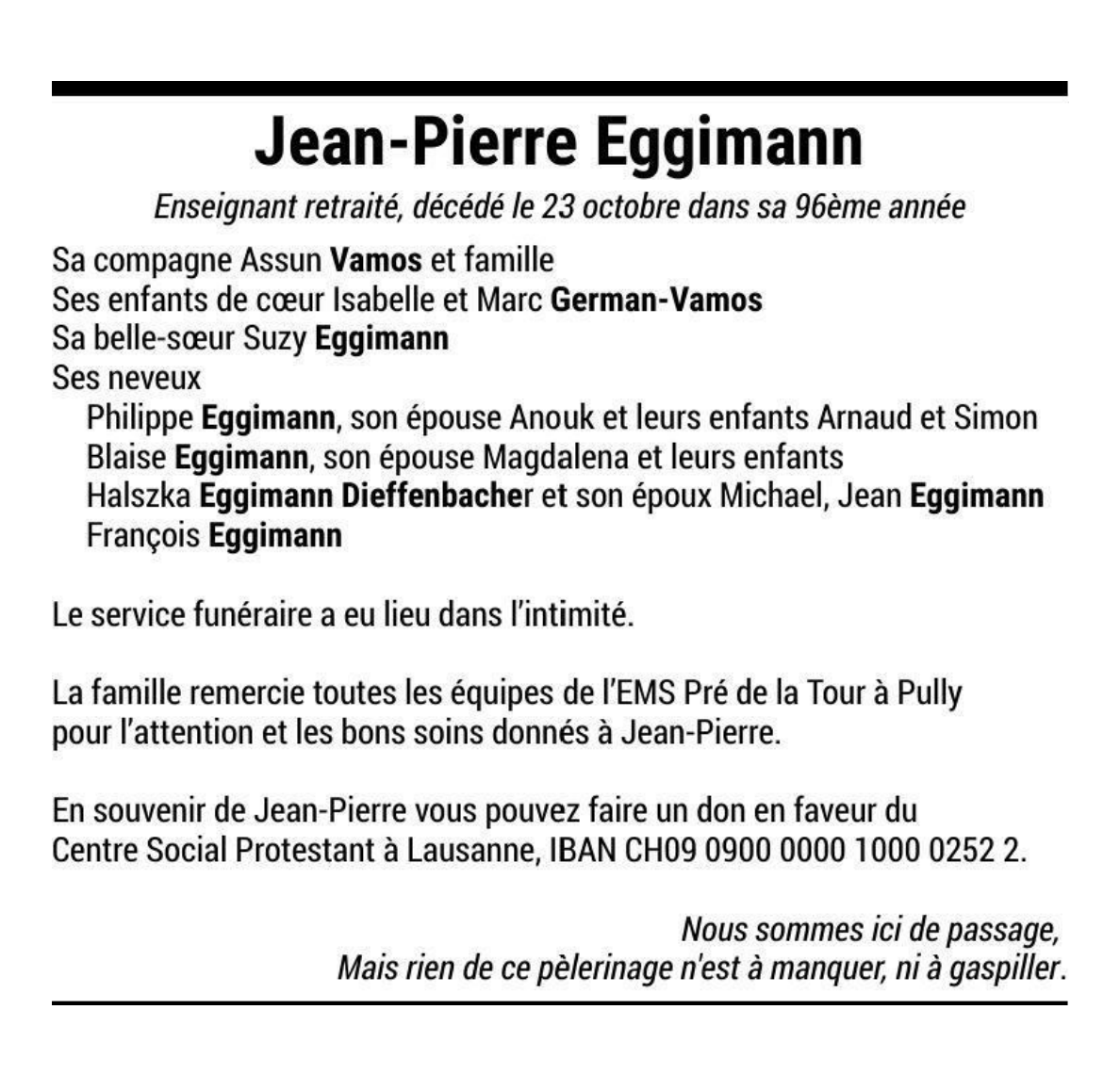 Jean-Pierre EGGIMANN 20 juil. 1927 - 23 oct. 2023 Avis mortuaire PFG Télecharger PDF Partager sur: Galerie PreviousNext PreviousNext