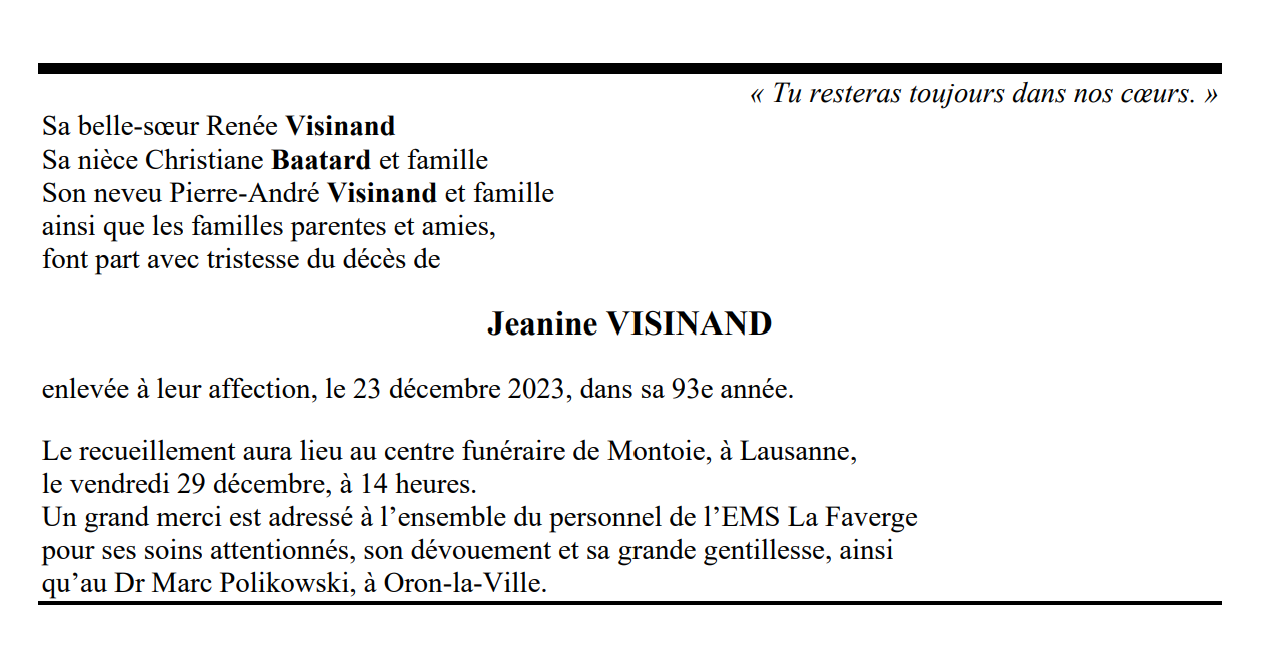 Jeanine VISINAND 06 aoû. 1931 - 23 déc. 2023 Avis mortuaire PFG Télecharger PDF Partager sur: Galerie PreviousNext PreviousNext