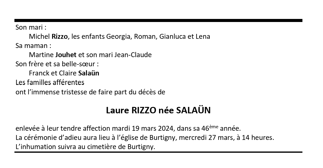Laure RIZZO née SALAÜN 10 juin. 1978 - 19 mar. 2024 Avis mortuaire PFG Télecharger PDF Partager sur: Galerie PreviousNext PreviousNext
