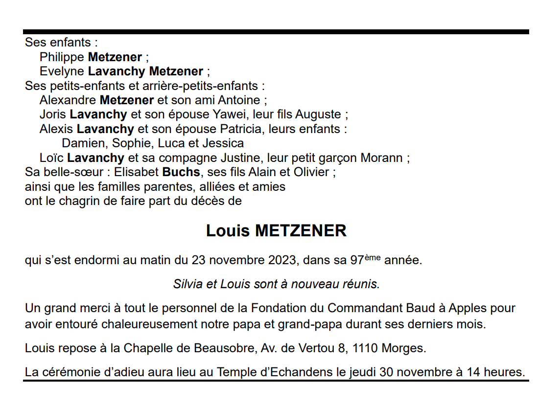 Louis METZENER 12 juil. 1927 - 23 nov. 2023 Avis mortuaire PFG Télecharger PDF Partager sur: Galerie PreviousNext PreviousNext