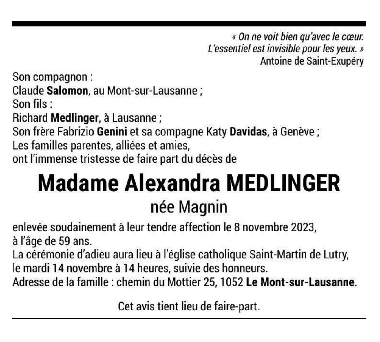 Madame Alexandra MEDLINGER née Magnin 08 sep. 1964 - 08 nov. 2023 Avis mortuaire PFG Télecharger PDF Partager sur: Galerie PreviousNext PreviousNext