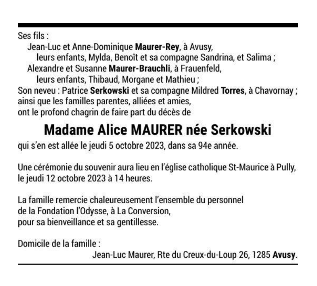 Madame Alice MAURER née Serkowski 12 jan. 1930 - 05 oct. 2023 Avis mortuaire PFG Télecharger PDF Partager sur: Galerie PreviousNext PreviousNext