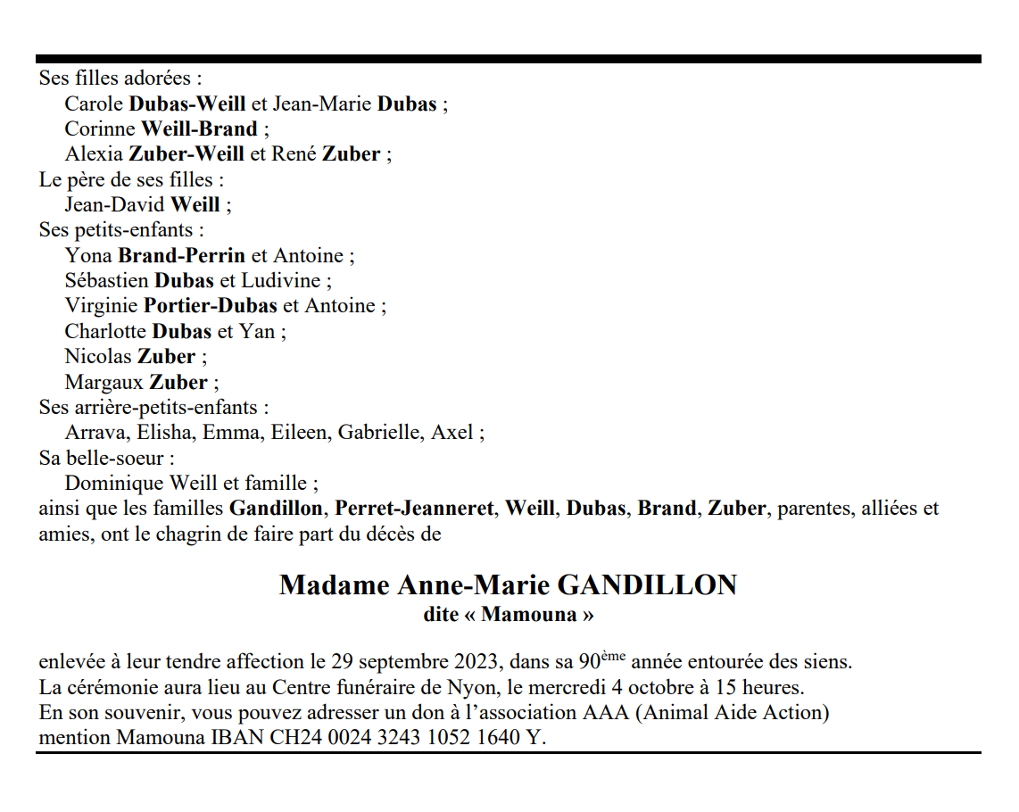 Madame Anne-Marie GANDILLON dite « Mamouna 13 mar. 1934 - 29 sep. 2023 Avis mortuaire PFG Télecharger PDF Partager sur: Galerie PreviousNext PreviousNext