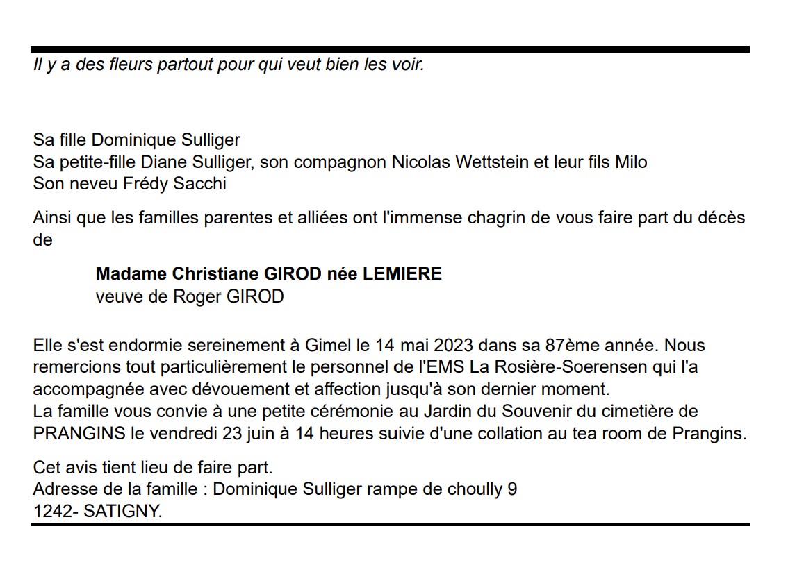 Madame Christiane GIROD née LEMIERE 03 fév. 1936 - 14 mai. 2023 Avis mortuaire PFG Télecharger PDF Partager sur: Galerie PreviousNext PreviousNext