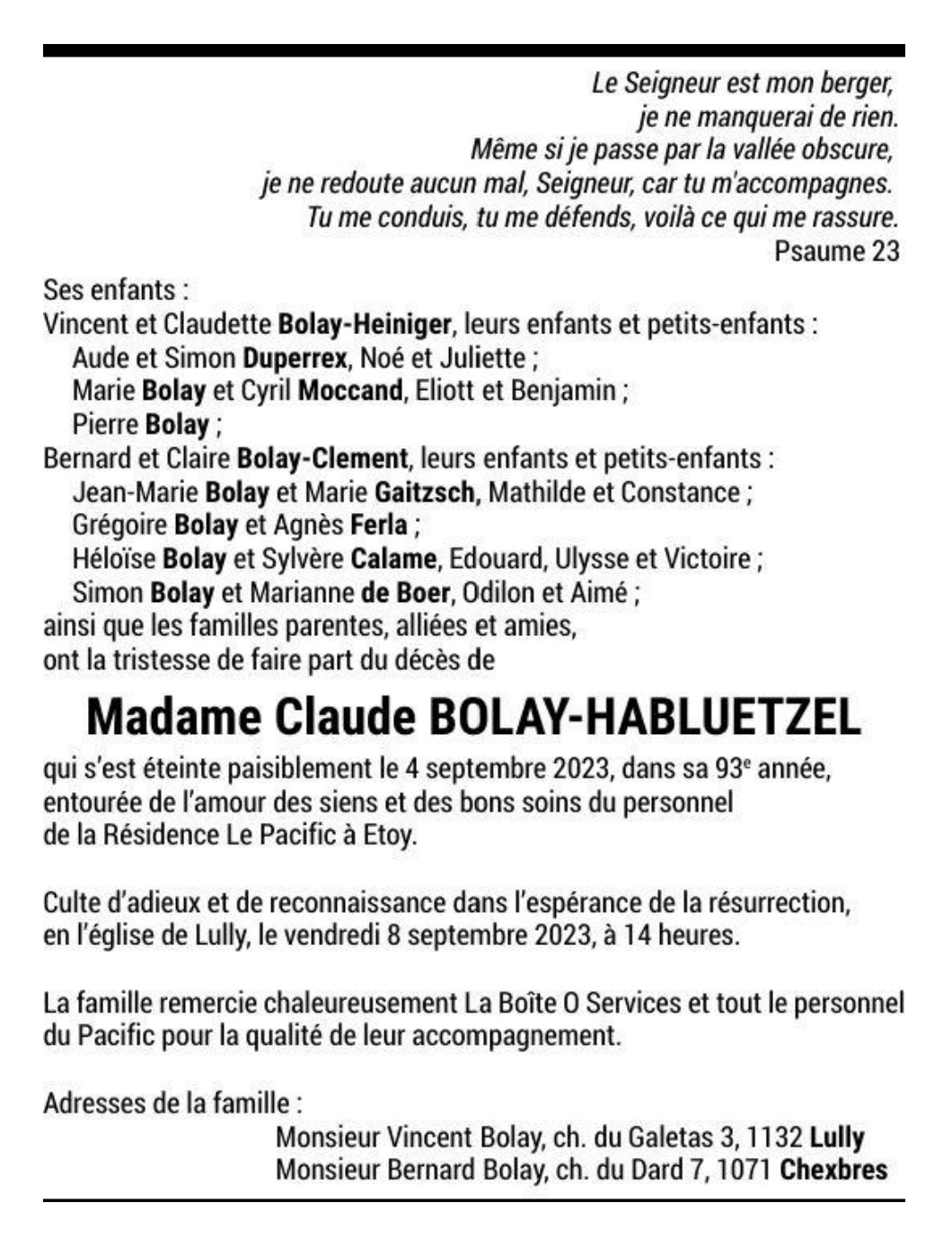 Madame Claude BOLAY-HABLUETZEL 12 nov. 1930 - 04 sep. 2023 Avis mortuaire PFG Télecharger PDF Partager sur: Galerie PreviousNext PreviousNext