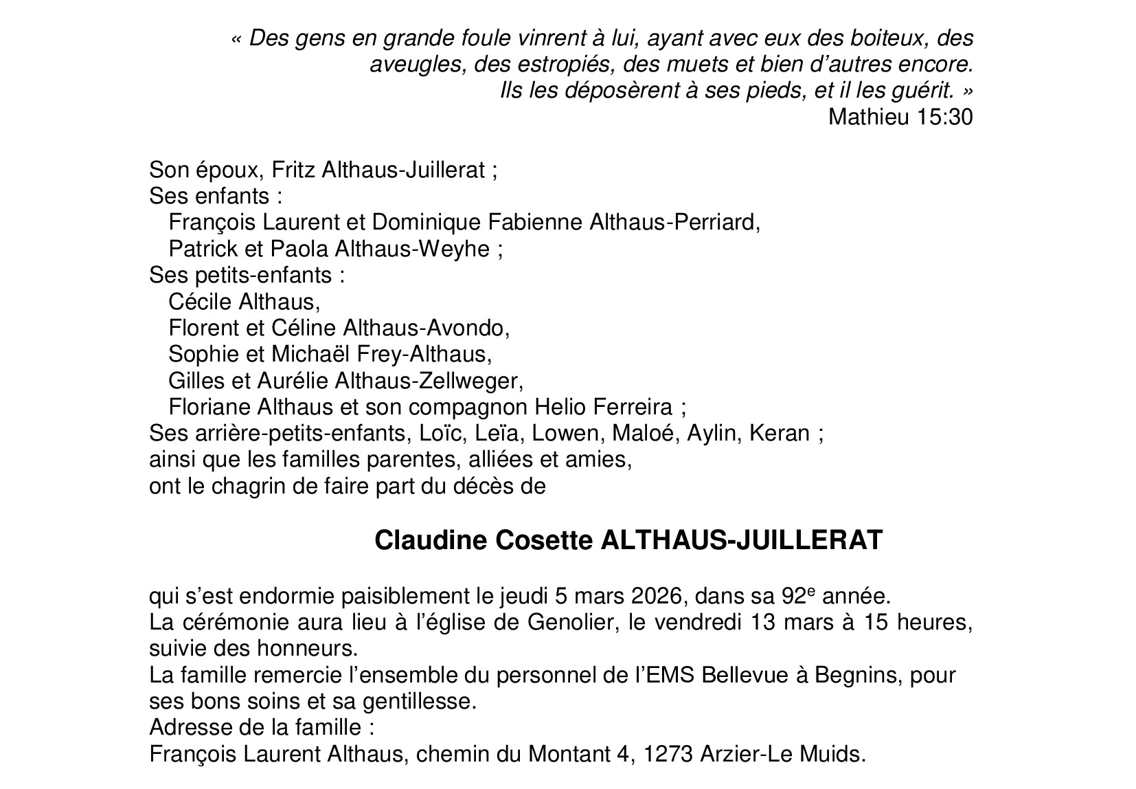 Madame Claudine Cosette ALTHAUS