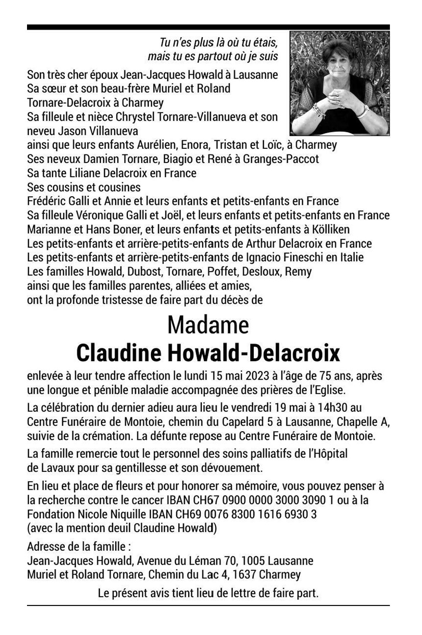 Madame Claudine Howald-Delacroix 02 mai. 1948 - 15 mai. 2023 Avis mortuaire PFG Télecharger PDF Partager sur: Galerie PreviousNext PreviousNext