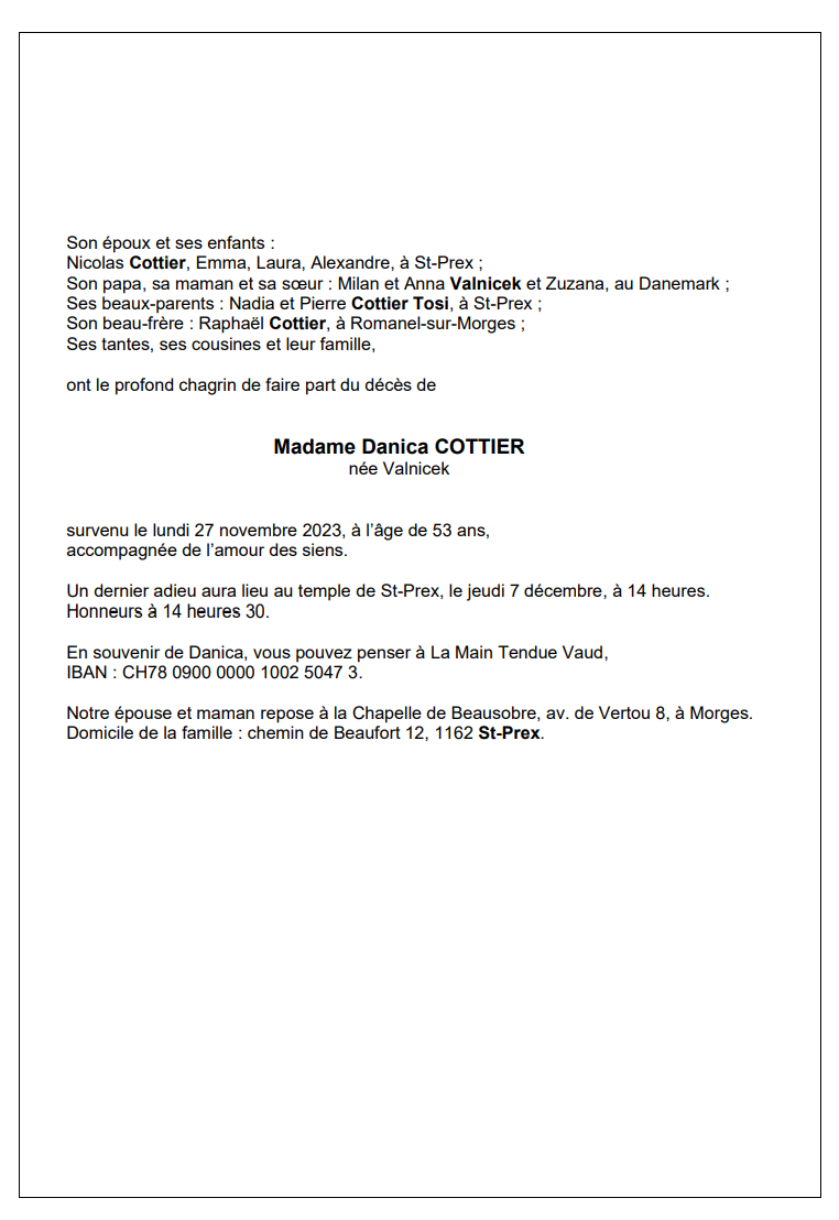 Madame Danica COTTIER née Valnicek 09 avr. 1970 - 27 nov. 2023 Avis mortuaire PFG Télecharger PDF Partager sur: Galerie PreviousNext PreviousNext