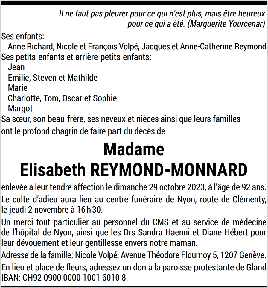 Madame Elisabeth REYMOND-MONNARD 12 juil. 1931 - 29 oct. 2023 Avis mortuaire PFG Télecharger PDF Partager sur: Galerie PreviousNext PreviousNext