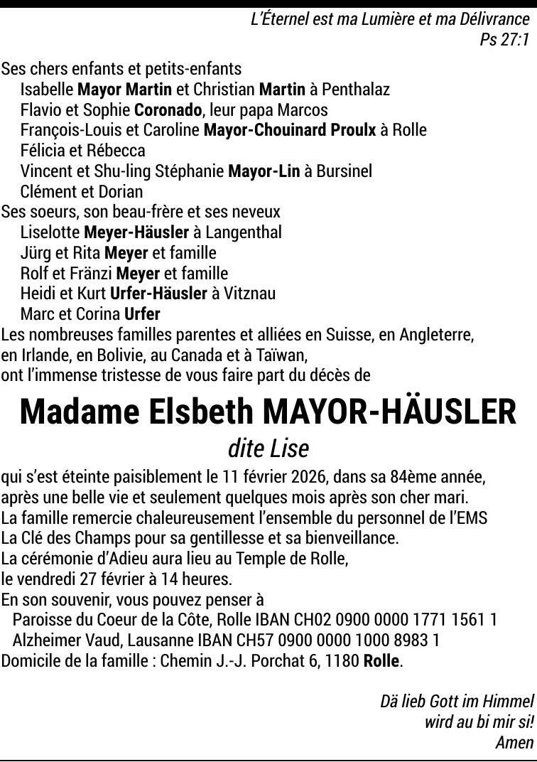 Madame Elsbeth Lise MAYOR-HÄUSLER 13 aoû. 1942 - 11 fév. 2026 Avis mortuaire PFG Partager sur: Galerie