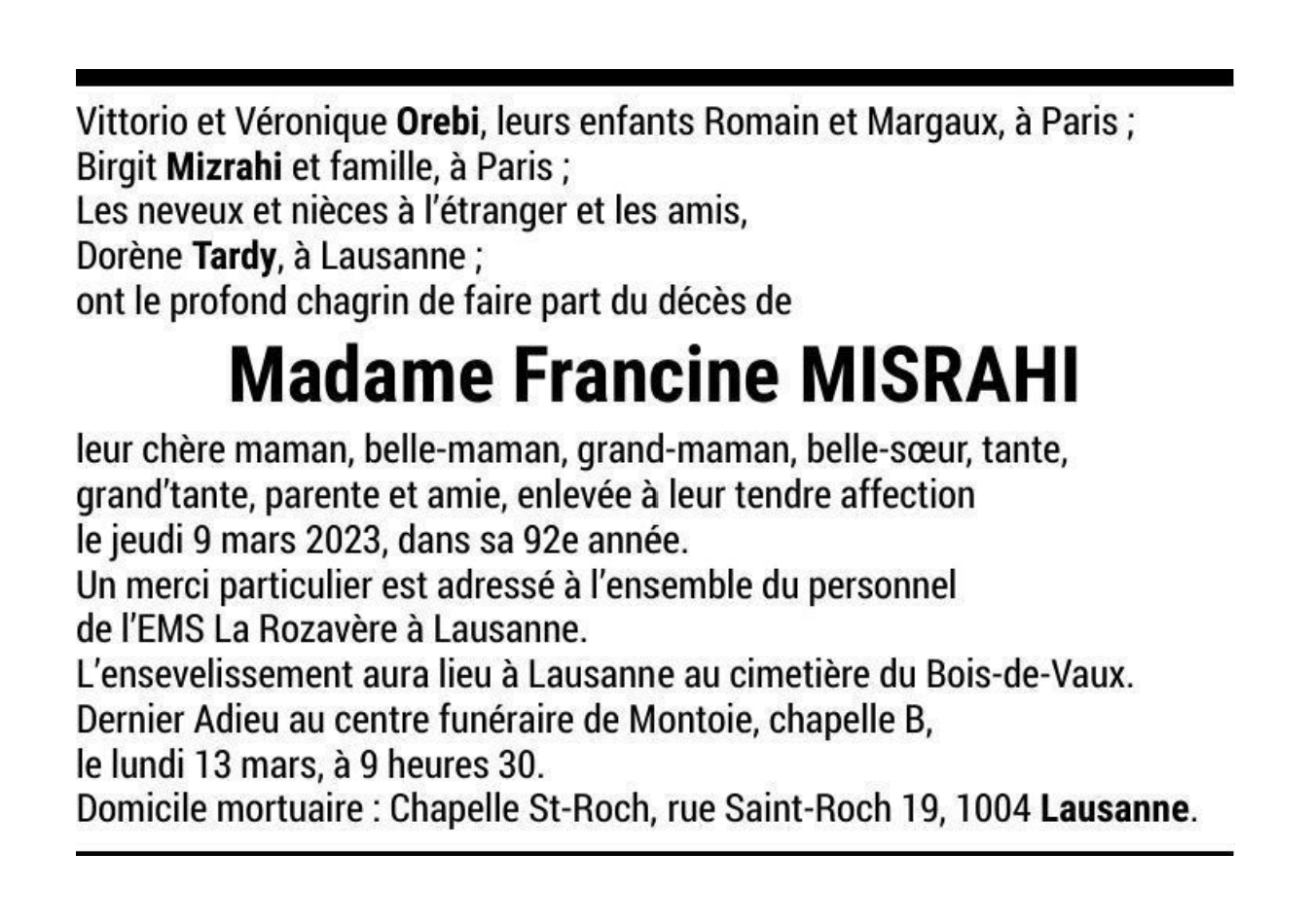 Madame Francine MISRAHI 24 nov. 1931 - 09 mar. 2023 Avis mortuaire PFG Télecharger PDF Partager sur: Galerie PreviousNext PreviousNext
