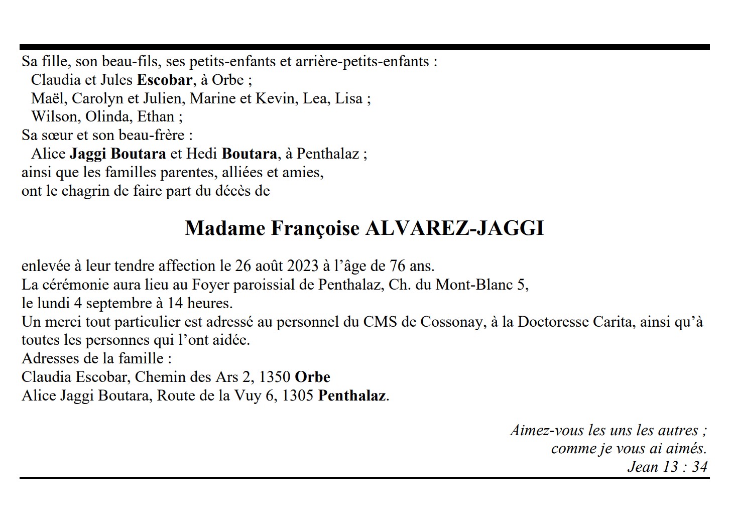Madame Françoise ALVAREZ-JAGGI 26 juin. 1947 - 26 aoû. 2023 Avis mortuaire PFG Télecharger PDF Partager sur: Galerie PreviousNext PreviousNext