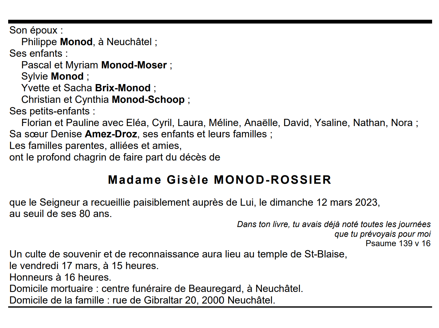 Madame Gisèle MONOD-ROSSIER 05 mai. 1943 - 12 mar. 2023 Avis mortuaire PFG Télecharger PDF Partager sur: Galerie PreviousNext PreviousNext