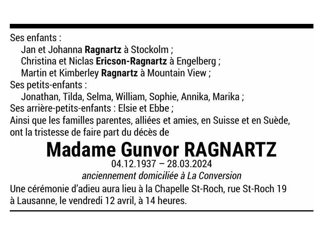 Madame Gunvor RAGNARTZ 04 déc. 1937 - 28 mar. 2024 Avis mortuaire PFG Télecharger PDF Partager sur: Galerie PreviousNext PreviousNext