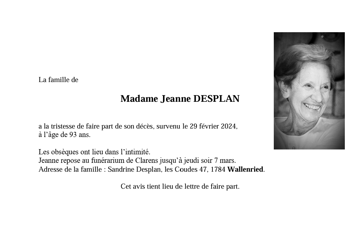Madame Jeanne DESPLAN 03 déc. 1930 - 29 fév. 2024 Avis mortuaire PFG Télecharger PDF Partager sur: Galerie