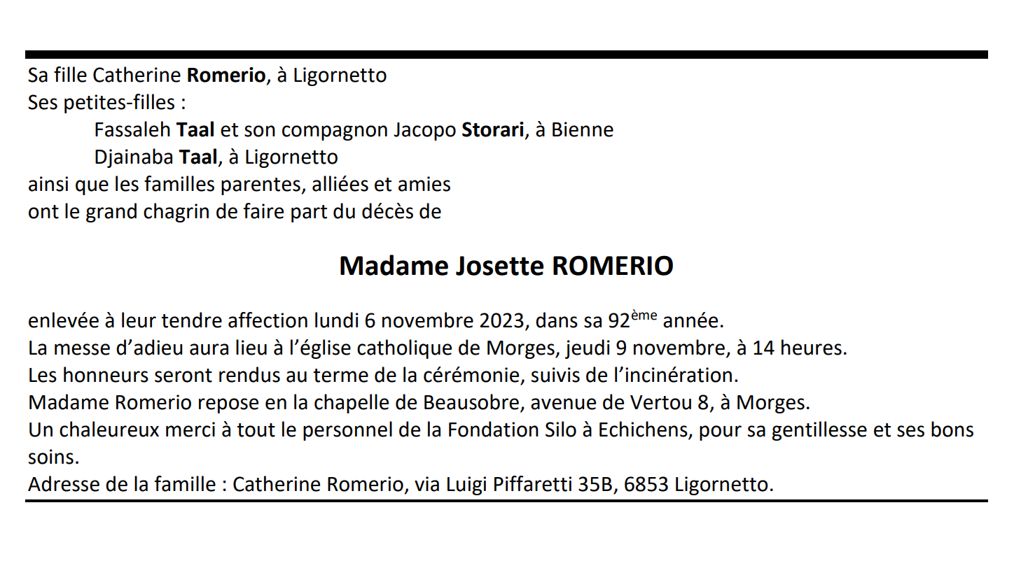 Madame Josette ROMERIO 26 nov. 1931 - 06 nov. 2023 Avis mortuaire PFG Télecharger PDF Partager sur: Galerie PreviousNext PreviousNext