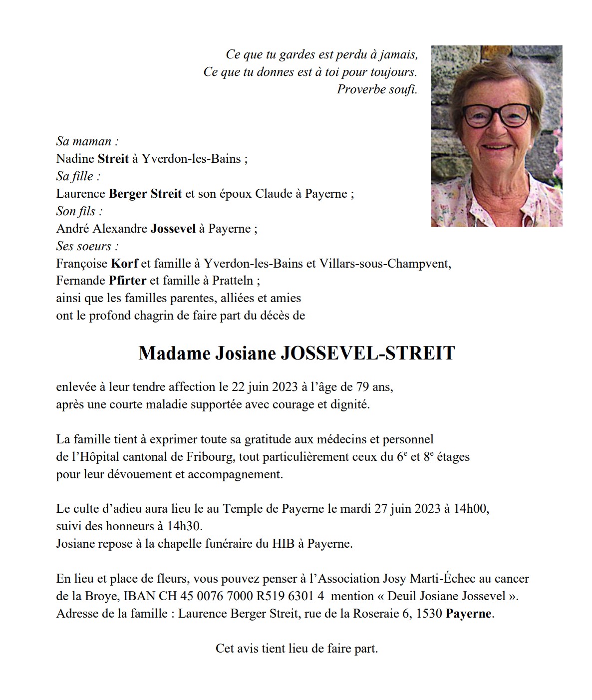 Madame Josiane JOSSEVEL-STREIT 27 aoû. 1943 - 22 juin. 2023 Avis mortuaire PFG Télecharger PDF Partager sur: Galerie PreviousNext PreviousNext