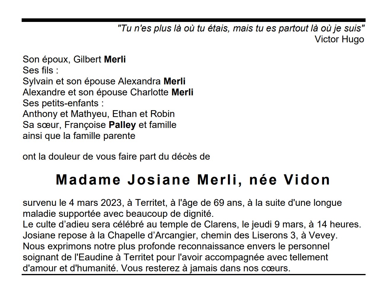 Madame Josiane Merli, née Vidon 21 jan. 1954 - 04 mar. 2023 Avis mortuaire PFG Télecharger PDF Partager sur: Galerie PreviousNext PreviousNext
