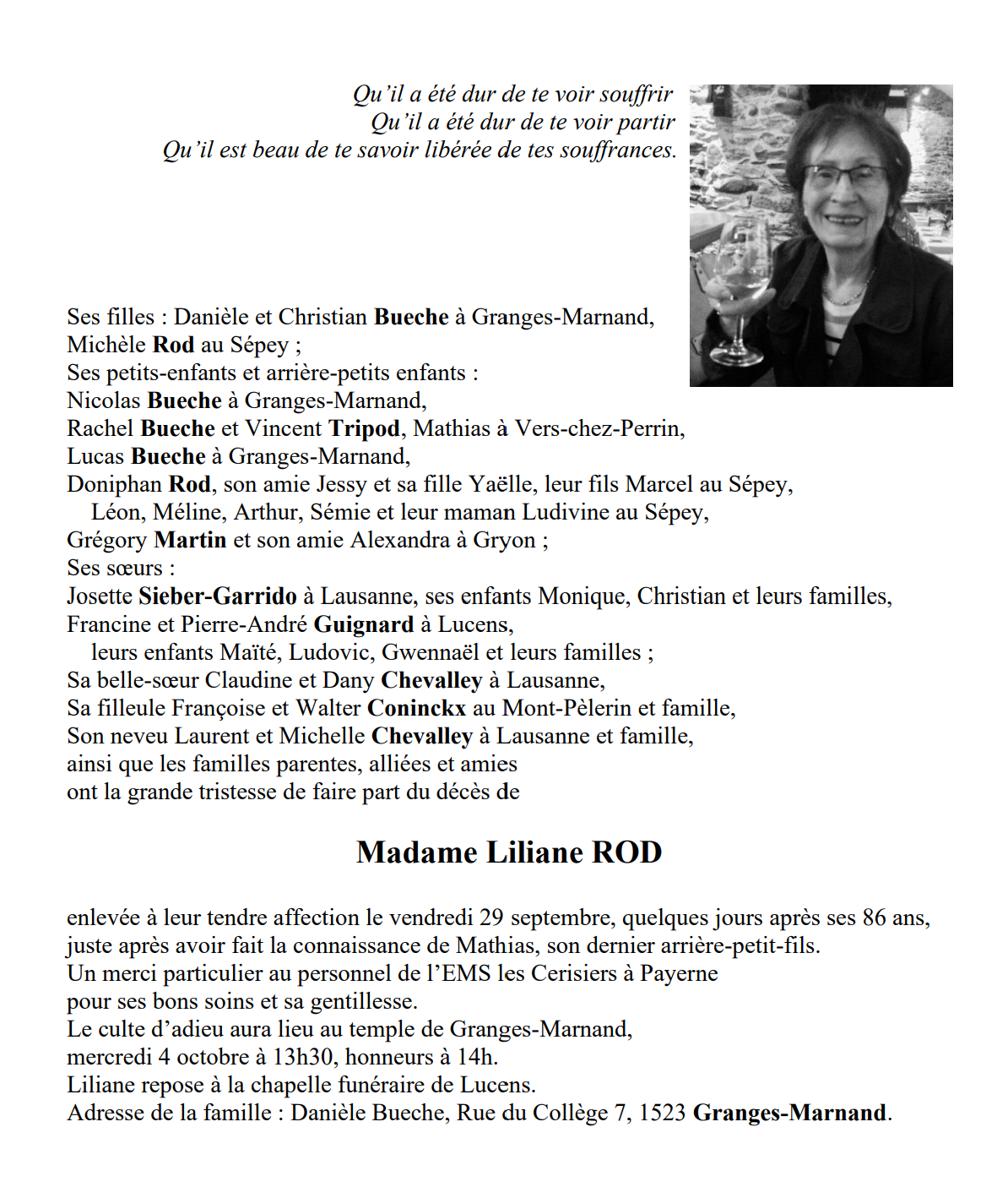 Madame Liliane ROD 07 sep. 1937 - 29 sep. 2023 Avis mortuaire PFG Télecharger PDF Partager sur: Galerie PreviousNext PreviousNext