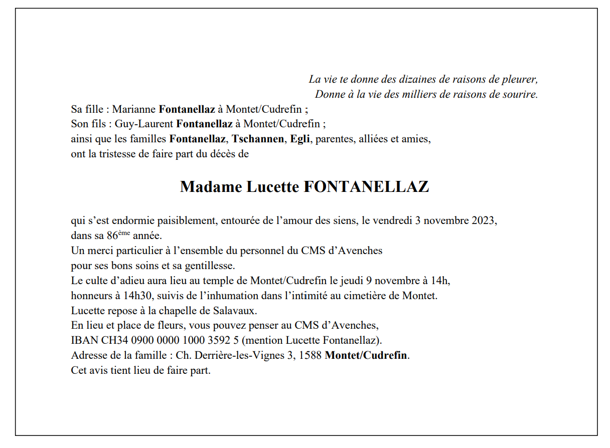 Madame Lucette FONTANELLAZ 21 mai. 1938 - 03 nov. 2023 Avis mortuaire PFG Télecharger PDF Partager sur: Galerie PreviousNext PreviousNext