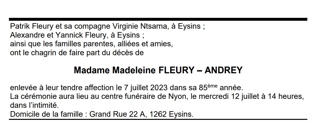 Madame Madeleine FLEURY – ANDREY 07 oct. 1938 - 07 juil. 2023 Avis mortuaire PFG Télecharger PDF Partager sur: Galerie PreviousNext PreviousNext