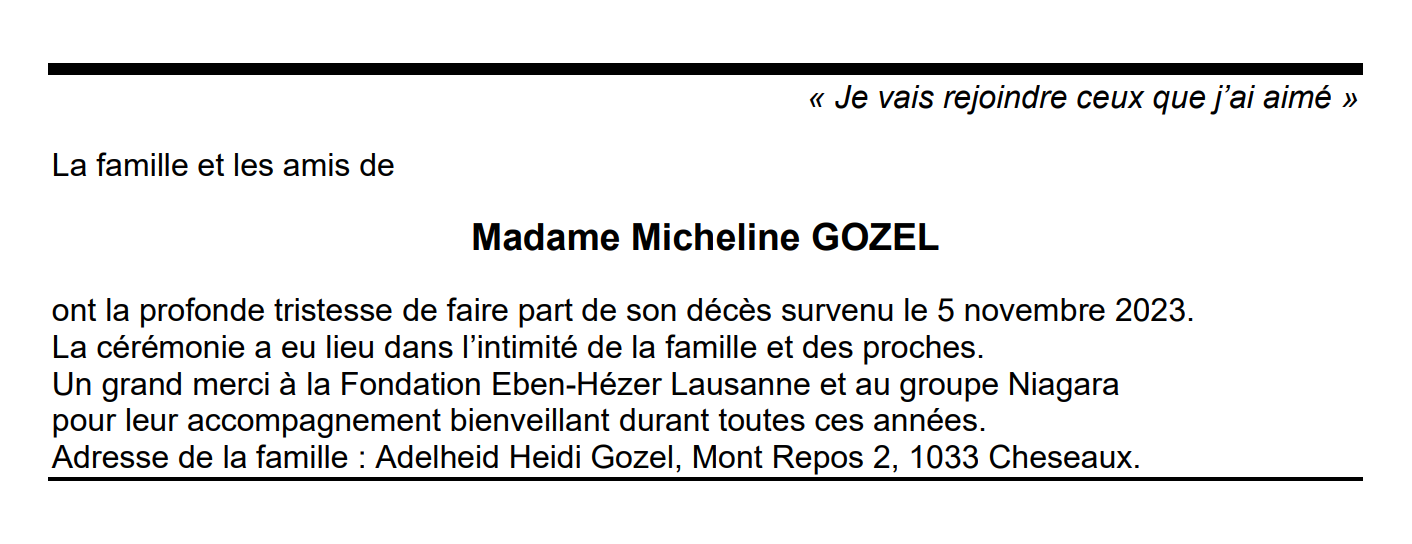 Madame Micheline GOZEL 17 juin. 1950 - 05 nov. 2023 Avis mortuaire PFG Télecharger PDF Partager sur: Galerie PreviousNext PreviousNext