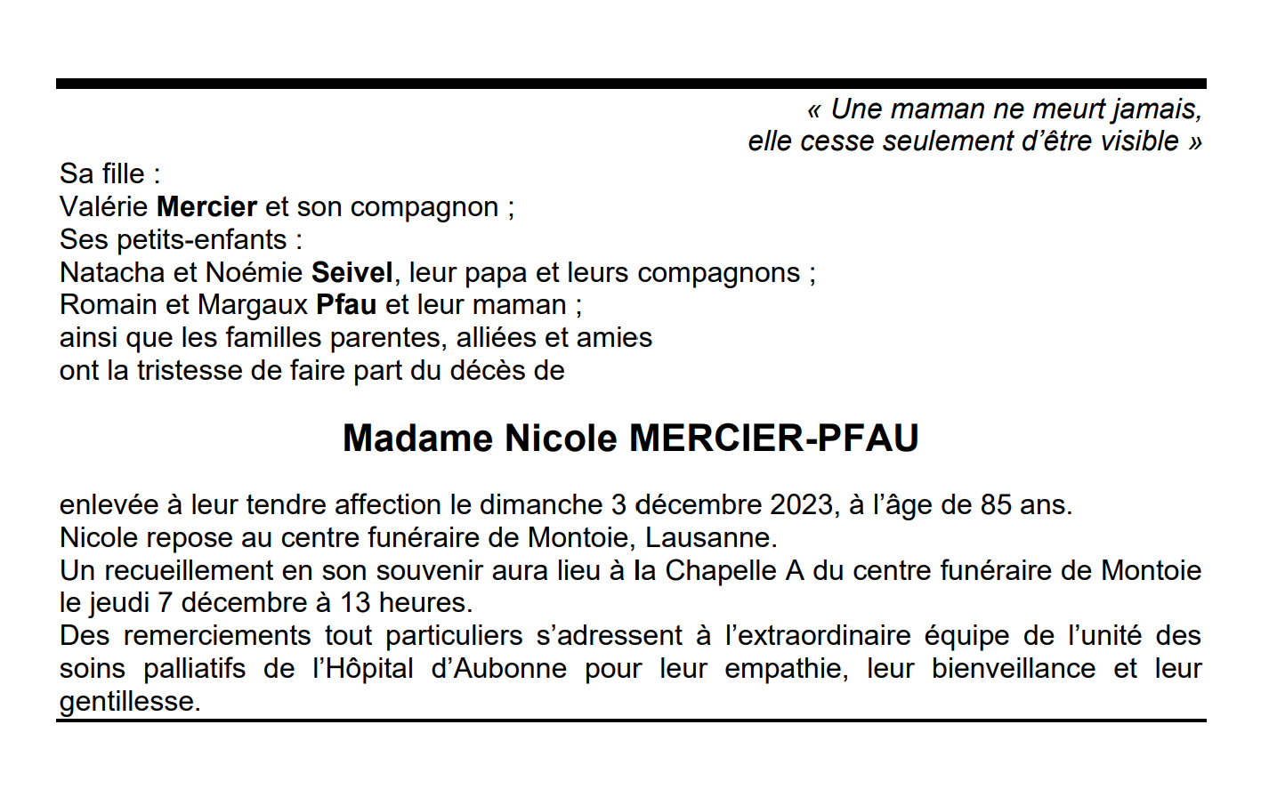 Madame Nicole MERCIER-PFAU 22 juin. 1938 - 03 déc. 2023 Avis mortuaire PFG Télecharger PDF Partager sur: Galerie PreviousNext PreviousNext
