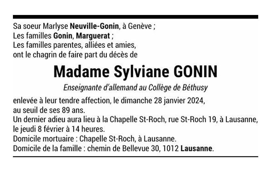 Madame Sylviane GONIN 09 aoû. 1935 - 28 jan. 2024 Avis mortuaire PFG Télecharger PDF Partager sur: Galerie PreviousNext PreviousNext