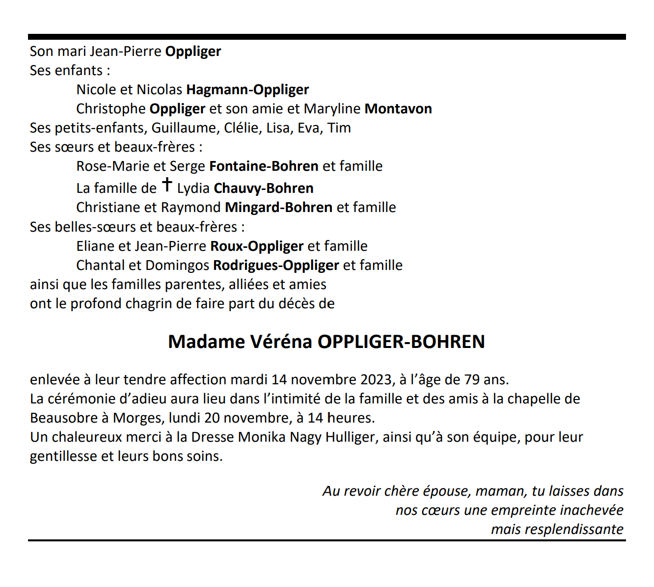 Madame Véréna OPPLIGER-BOHREN 24 juil. 1944 - 14 nov. 2023 Avis mortuaire PFG Télecharger PDF Partager sur: Galerie PreviousNext PreviousNext