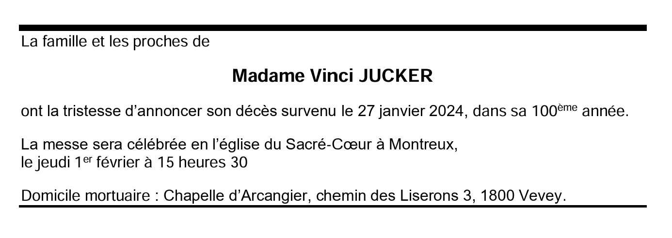 Madame Vinci JUCKER 18 mar. 1924 - 27 jan. 2024 Avis mortuaire PFG Télecharger PDF Partager sur: Galerie PreviousNext PreviousNext