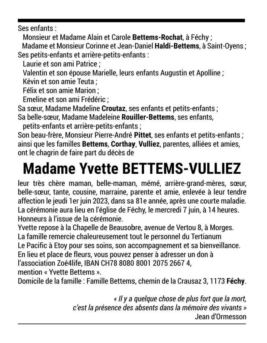 Madame Yvette BETTEMS-VULLIEZ 27 sep. 1942 - 01 juin. 2023 Avis mortuaire PFG Télecharger PDF Partager sur: Galerie PreviousNext PreviousNext