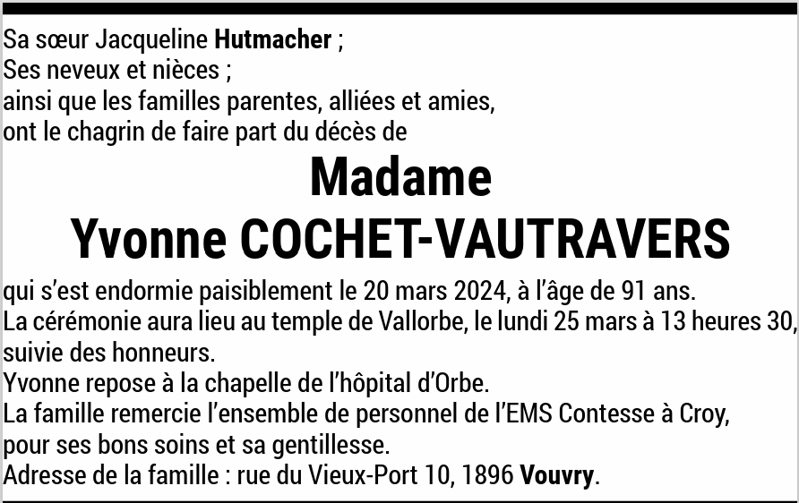 Madame Yvonne COCHET-VAUTRAVERS 30 jan. 1933 - 20 mar. 2024 Avis mortuaire PFG Télecharger PDF Partager sur: Galerie PreviousNext PreviousNext