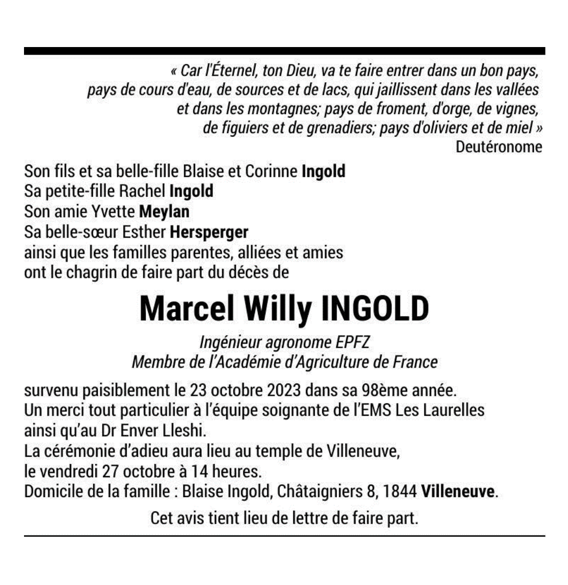 Marcel Willy INGOLD 03 déc. 1925 - 23 oct. 2023 Avis mortuaire PFG Télecharger PDF Partager sur: Galerie PreviousNext PreviousNext