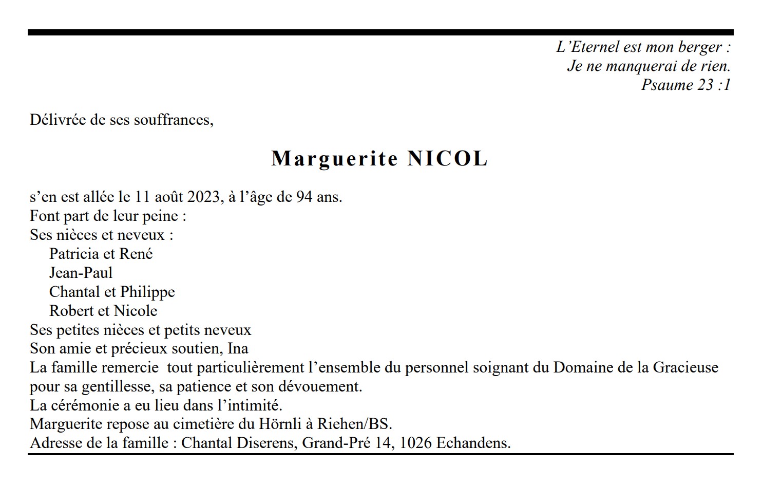 Marguerite NICOL 30 juin. 1929 - 11 aoû. 2023 Avis mortuaire PFG Télecharger PDF Partager sur: Galerie PreviousNext PreviousNext