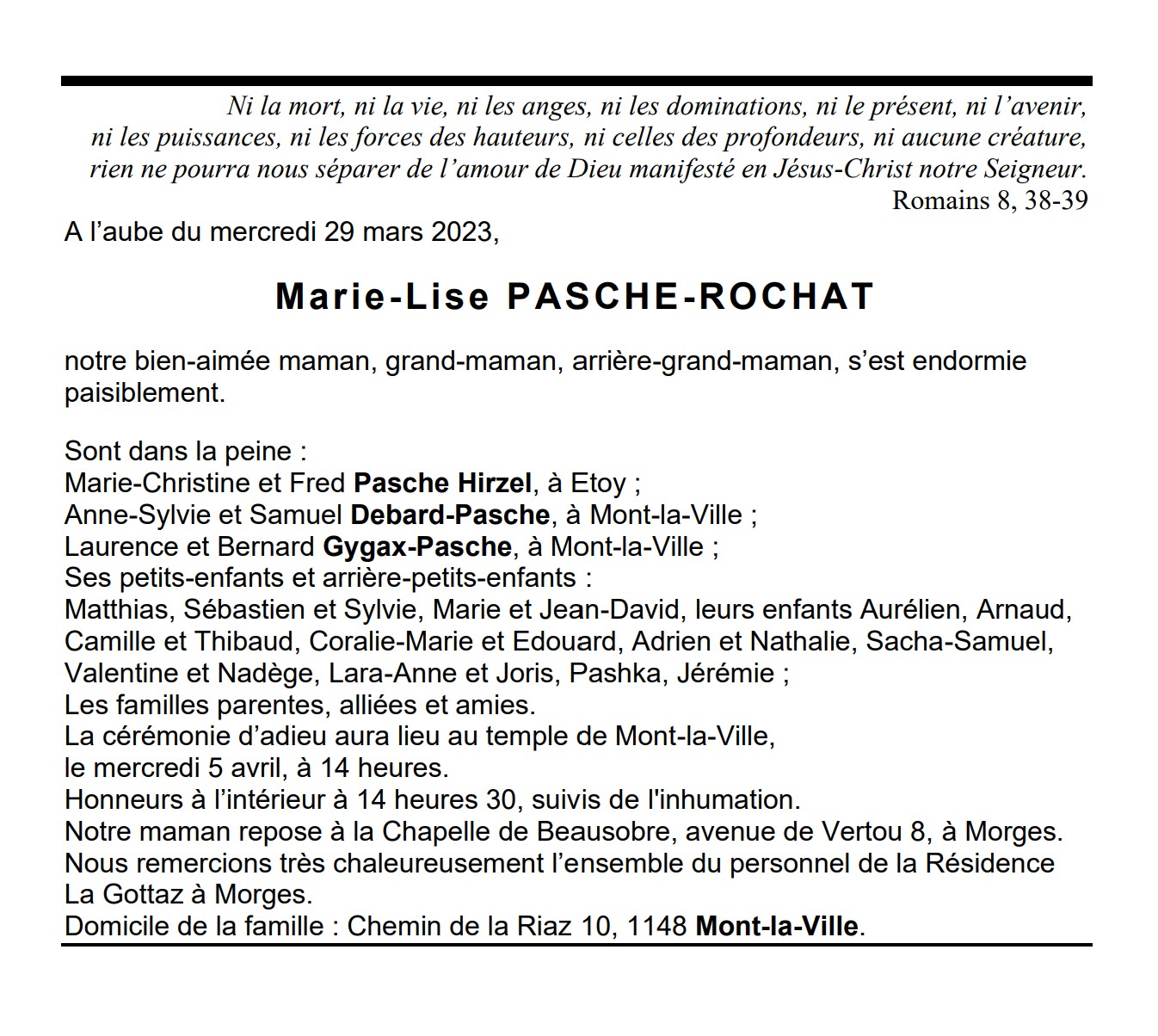 Marie-Lise PASCHE-ROCHAT 03 mar. 1937 - 29 mar. 2023 Avis mortuaire PFG Télecharger PDF Partager sur: Galerie PreviousNext PreviousNext