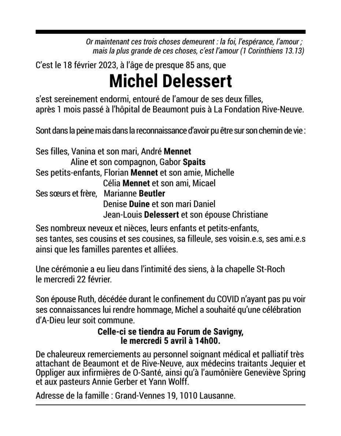 Michel DELESSERT 08 juin. 1938 - 18 fév. 2023 Avis mortuaire PFG Télecharger PDF Partager sur: Galerie PreviousNext PreviousNext