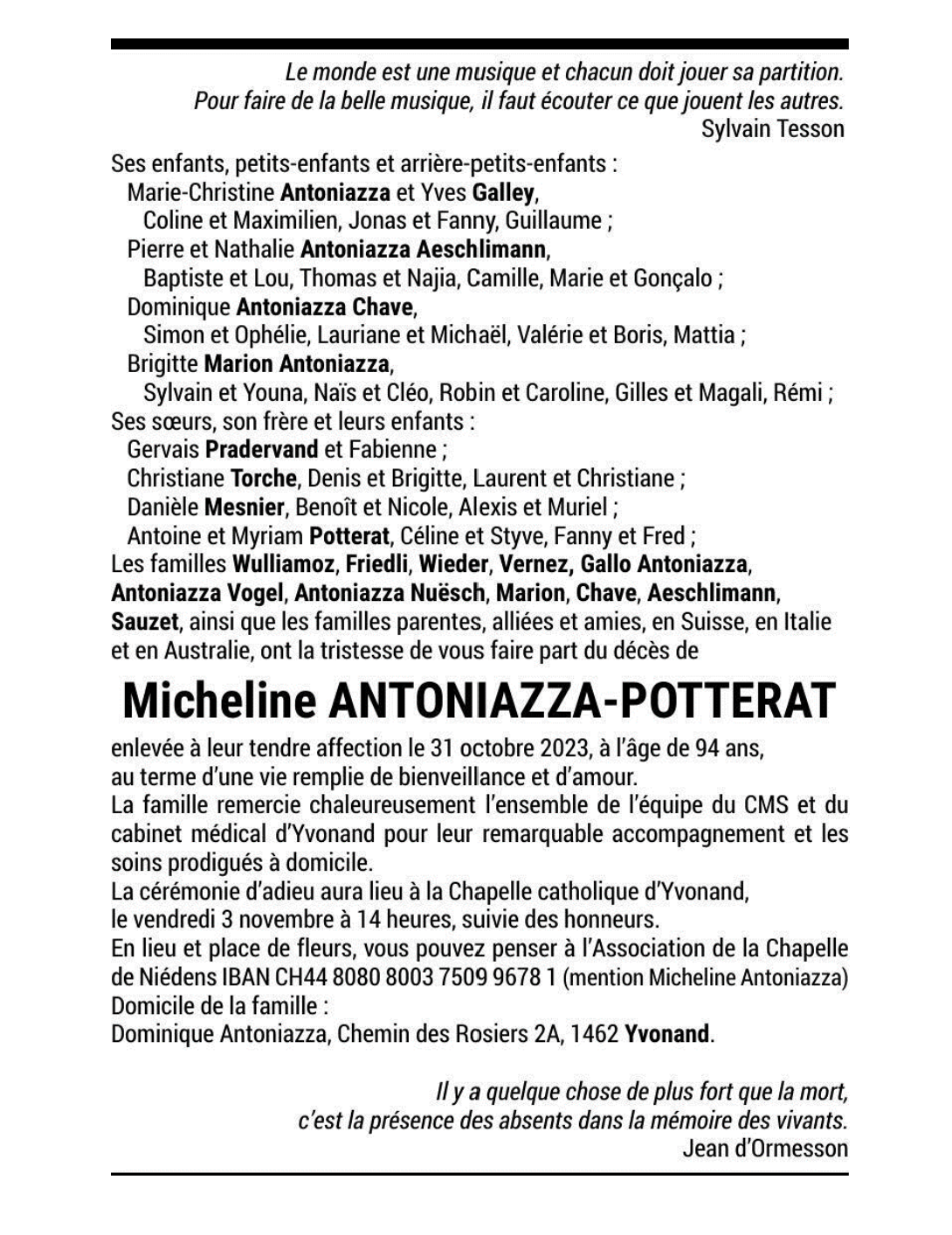 Micheline ANTONIAZZA-POTTERAT 31 oct. 1929 - 31 oct. 2023 Avis mortuaire PFG Télecharger PDF Partager sur: Galerie PreviousNext PreviousNext