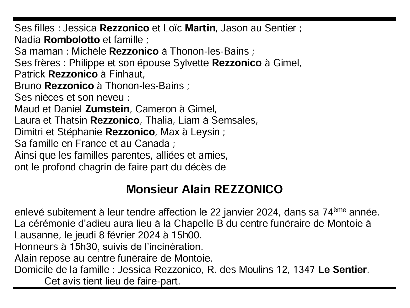 Monsieur Alain REZZONICO 02 mar. 1950 - 22 jan. 2024 Avis mortuaire PFG Télecharger PDF Partager sur: Galerie PreviousNext PreviousNext