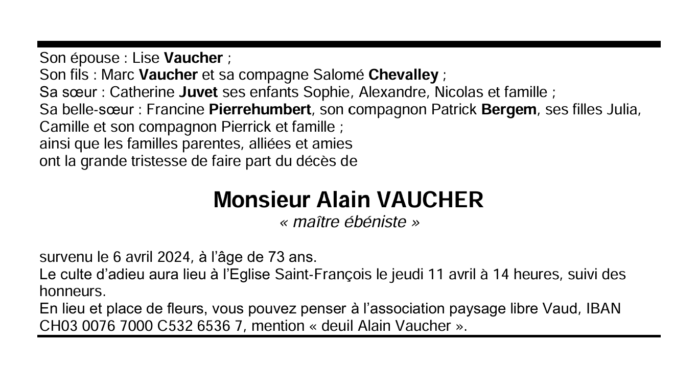 Monsieur Alain VAUCHER « maître ébéniste » 02 déc. 1950 - 06 avr. 2024 Avis mortuaire PFG Télecharger PDF Partager sur: Galerie PreviousNext PreviousNext
